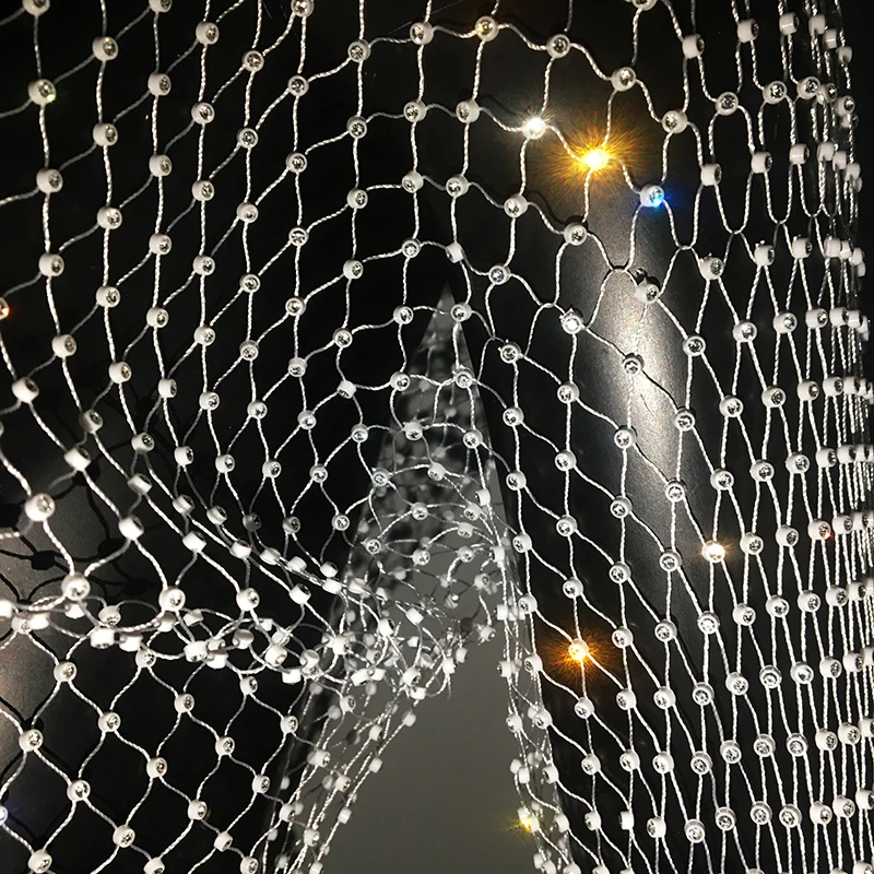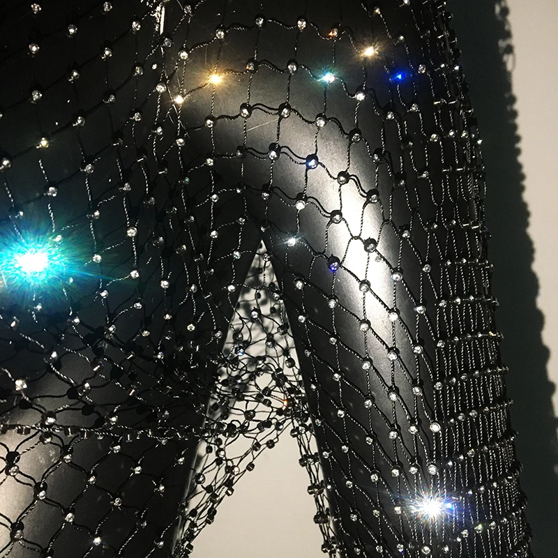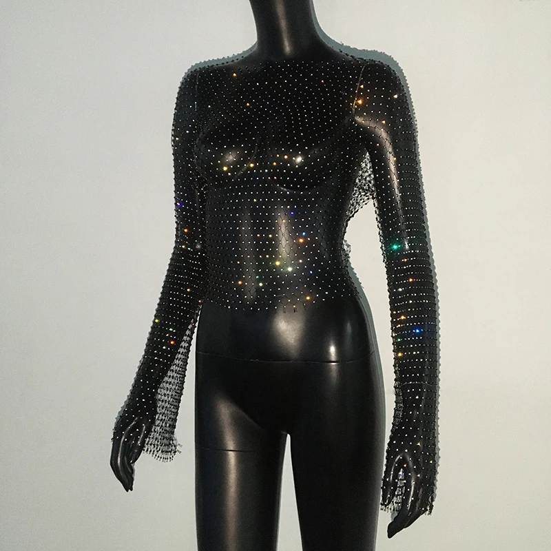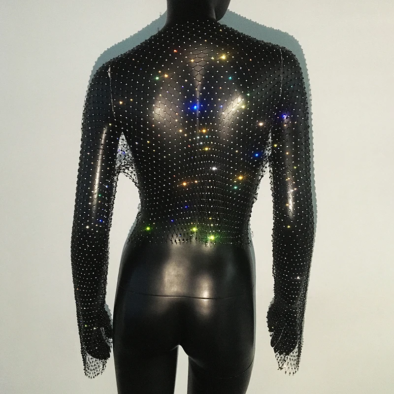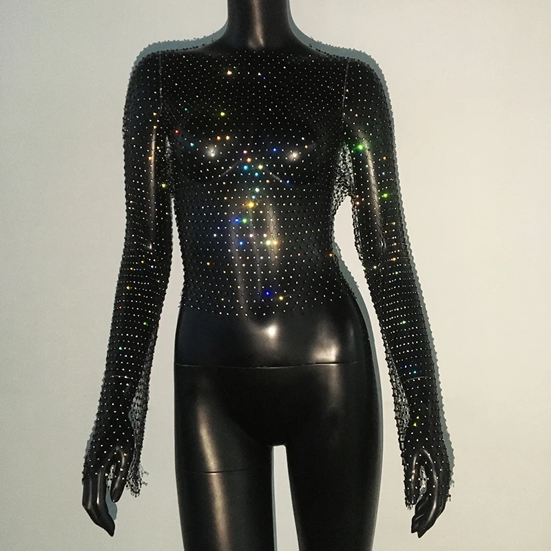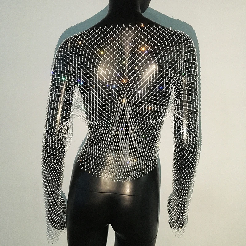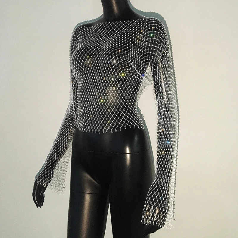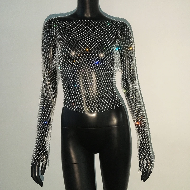 Bling Rhinestone Hollow Out Fishnet Grid T Shirt